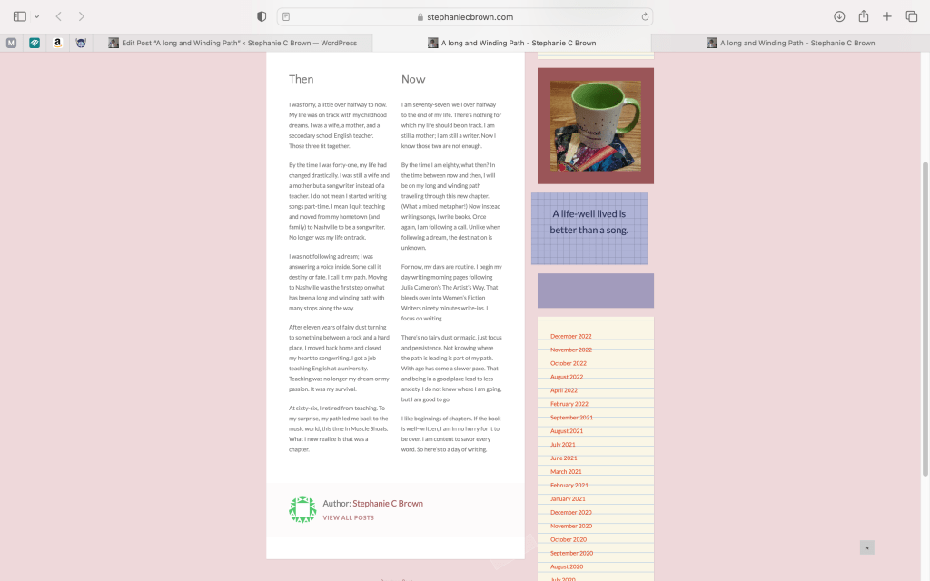 Why I am seventy-five and still not settled into a traditional well-worn path, I will never know. Thank you for being part of my journey.